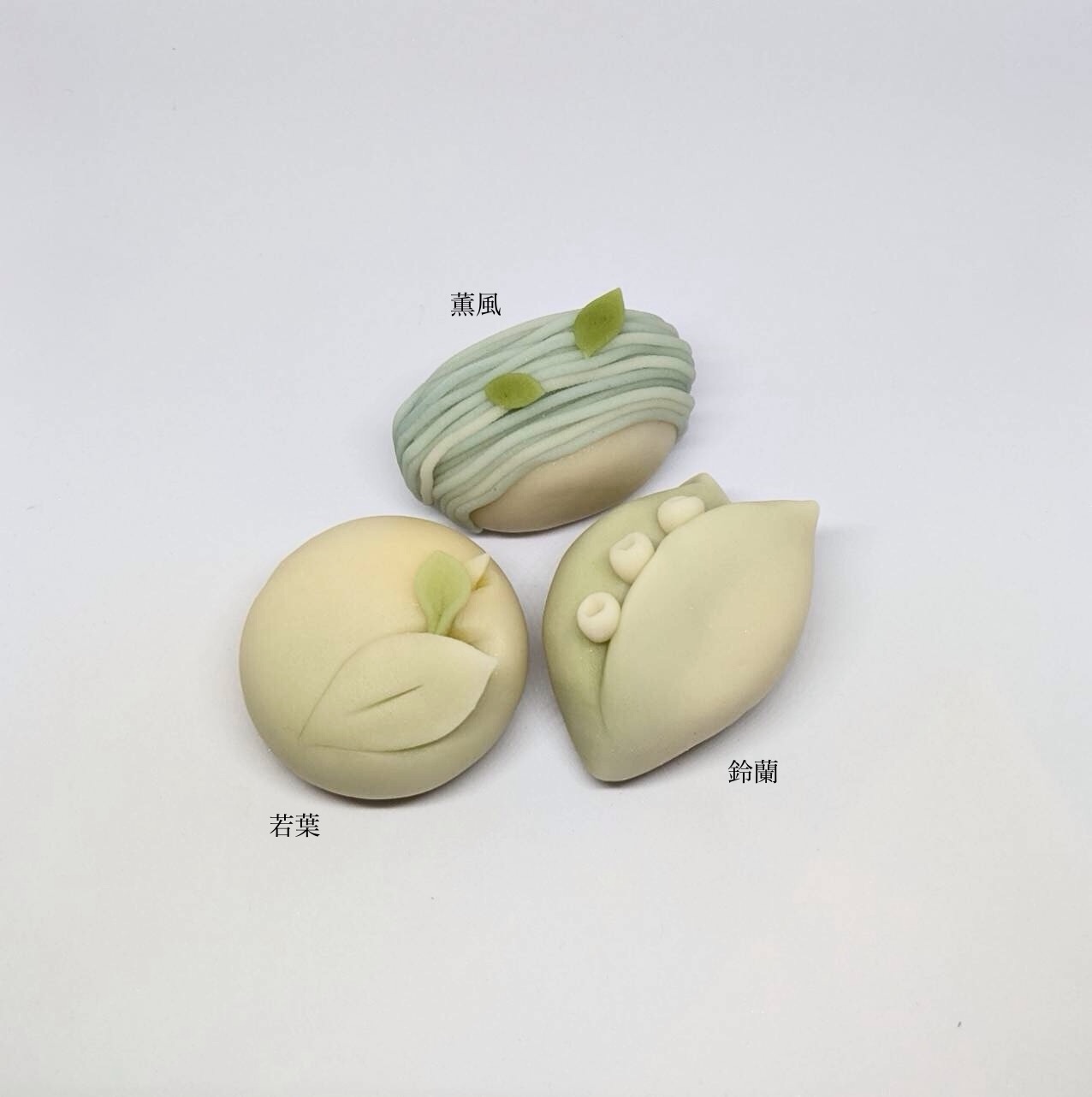 5月の季節の練り切りレッスンは「薫風ー粒餡」「若葉ーこし餡」「鈴蘭ー白餡」です。