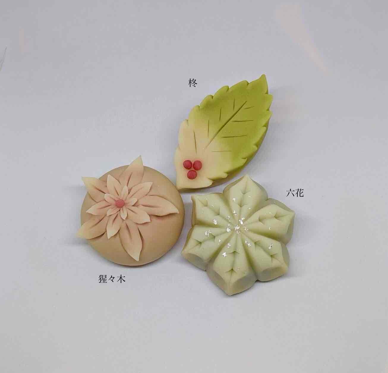 12月にお作りする練り切り&季節の練り切りレッスンは「柊ーつぶ餡」「猩々木ーこし餡」「六花ー白餡」です。