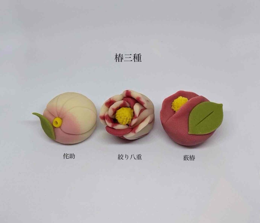 2月の季節の練り切りレッスンは椿三種「侘助ー白餡」「絞り八重ー白餡」「藪椿ー... -